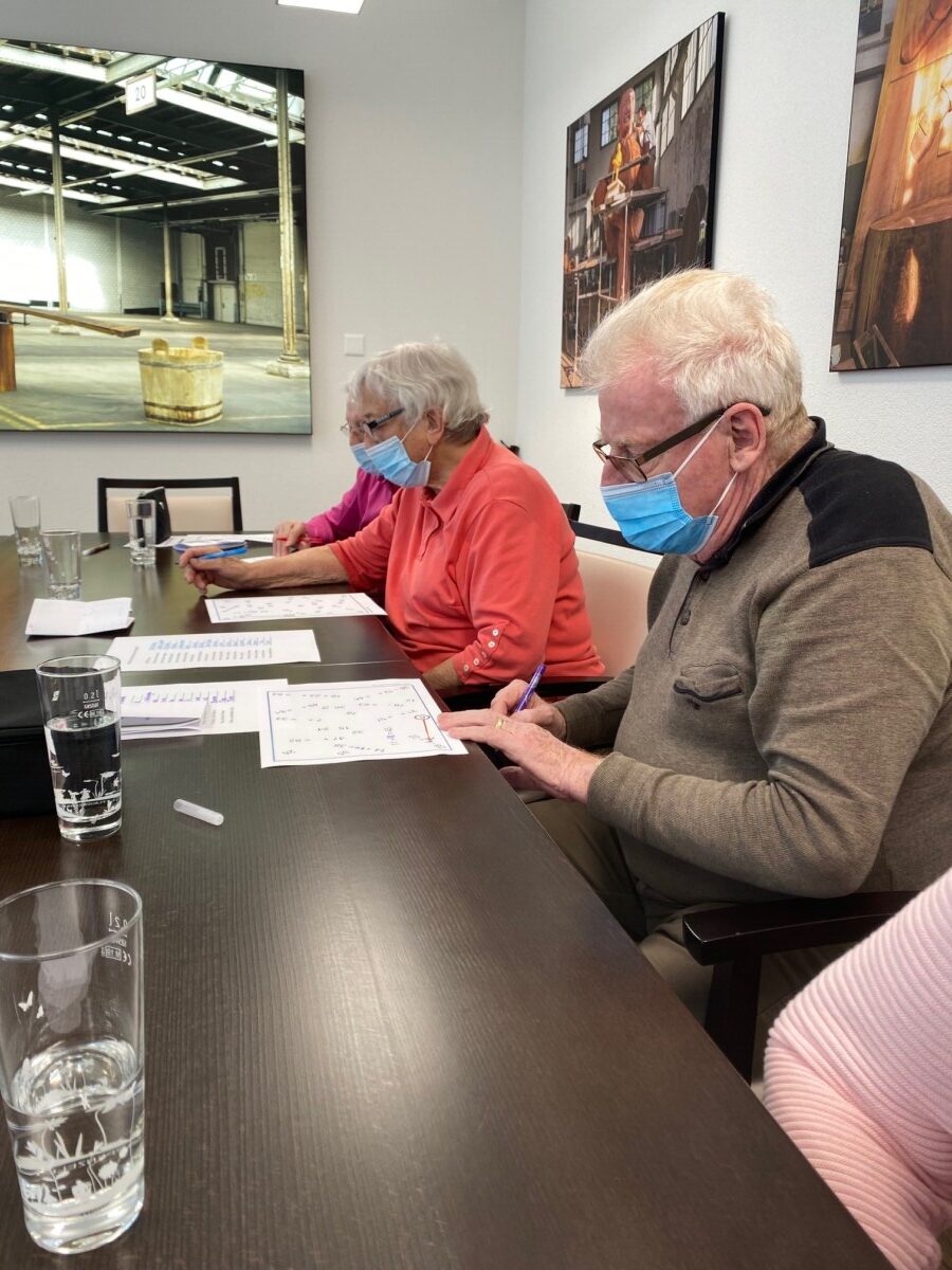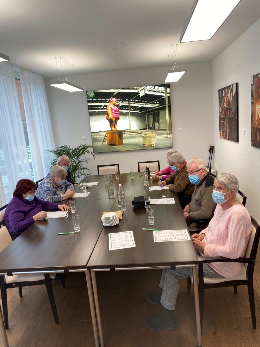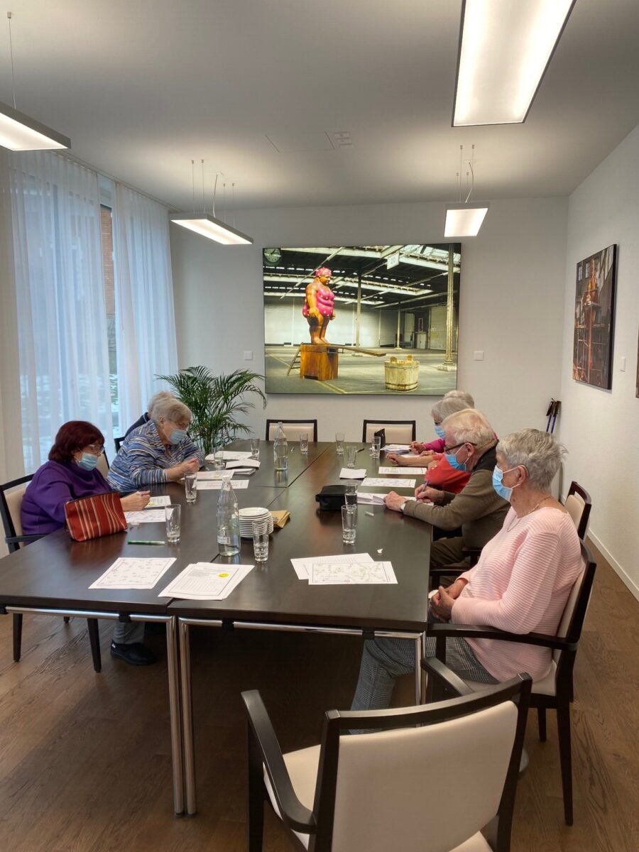 Heute wurde getuschelt, gerätselt und nach der richtigen Antwort gesucht. Als erstes durfte jede und jeder einen Namen der Gruppe ziehen und zehn Adjektive zu der Person nennen. Es war lustig zu sehen, wie viele Senioren, dieselben Eigenschaften wählten. Dann gab es knifflige Mathematik-Aufgaben und ein Kreuzworträtsel zu lösen. Anschliessend suchten wir verschiedene Dinge und Orte, die mit demselben Buchstaben begannen. Zum Abschluss gabs noch einen feinen Kuchen und Kaffee persönlich serviert von unserem Küchenchef.