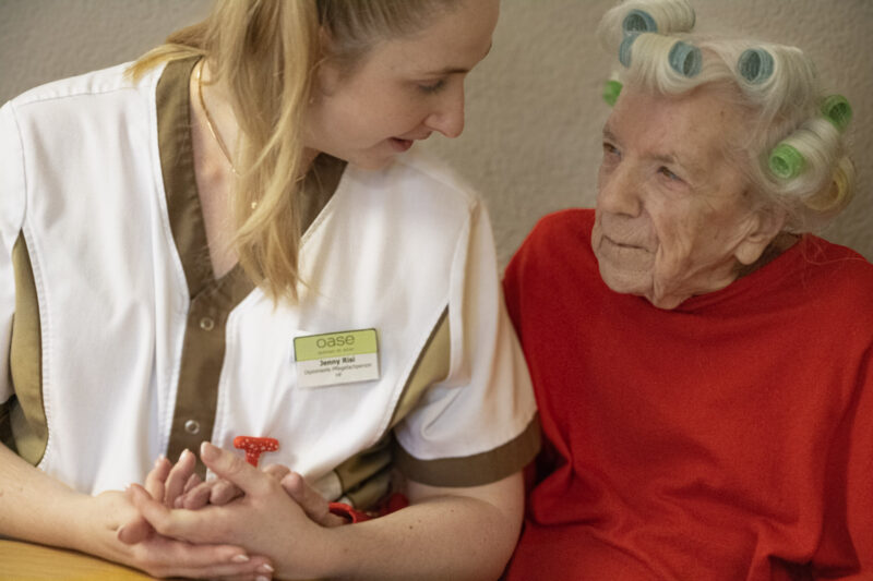 Die Bewohnerinnen und Bewohner lassen sich so richtig verwöhnen. Niemand lässt sich diesen speziellen Nachmittag entgehen. Die Pflegerinnen erfüllen mit Hingabe jeden Wunsch – von Handpeeling über Fussbäder und Nagellack bis hin zur Gesichtsmaske inklusive Gurken auf den Augen ist alles dabei. Zum krönenden Abschluss werden auch noch die Haare hübsch frisiert. Zapfenlocken sind besonders hoch im Kurs. Als Stärkung gibt es danach Kaffee und selbstgebackene Guetzli.